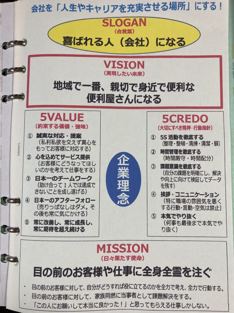 この企業理念リフィルを、全員に配布しているシステム手帳の1番前にファイリングしています。